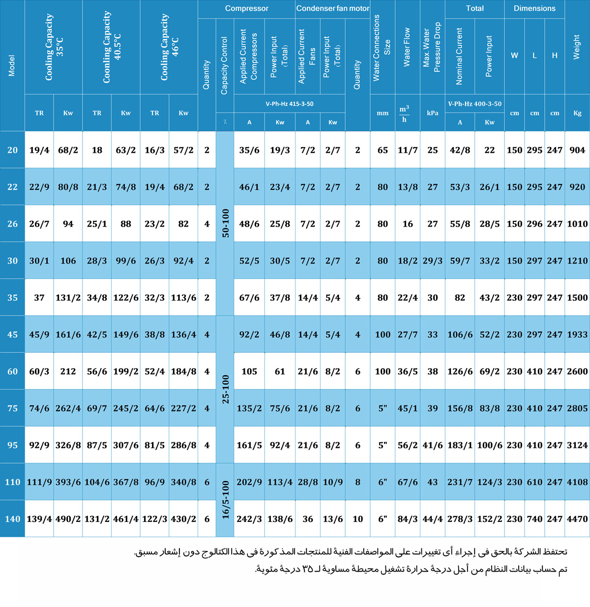 - مبردات هواء من نوع تشيلر سكرول مع إمكانية التصميم باستخدام ضواغط ذات سعات مختلفة في دارة واحدة من أجل تقليل استهلاك الطاقة في حالة وضع التشغيل مع حمولة جزئية part load.