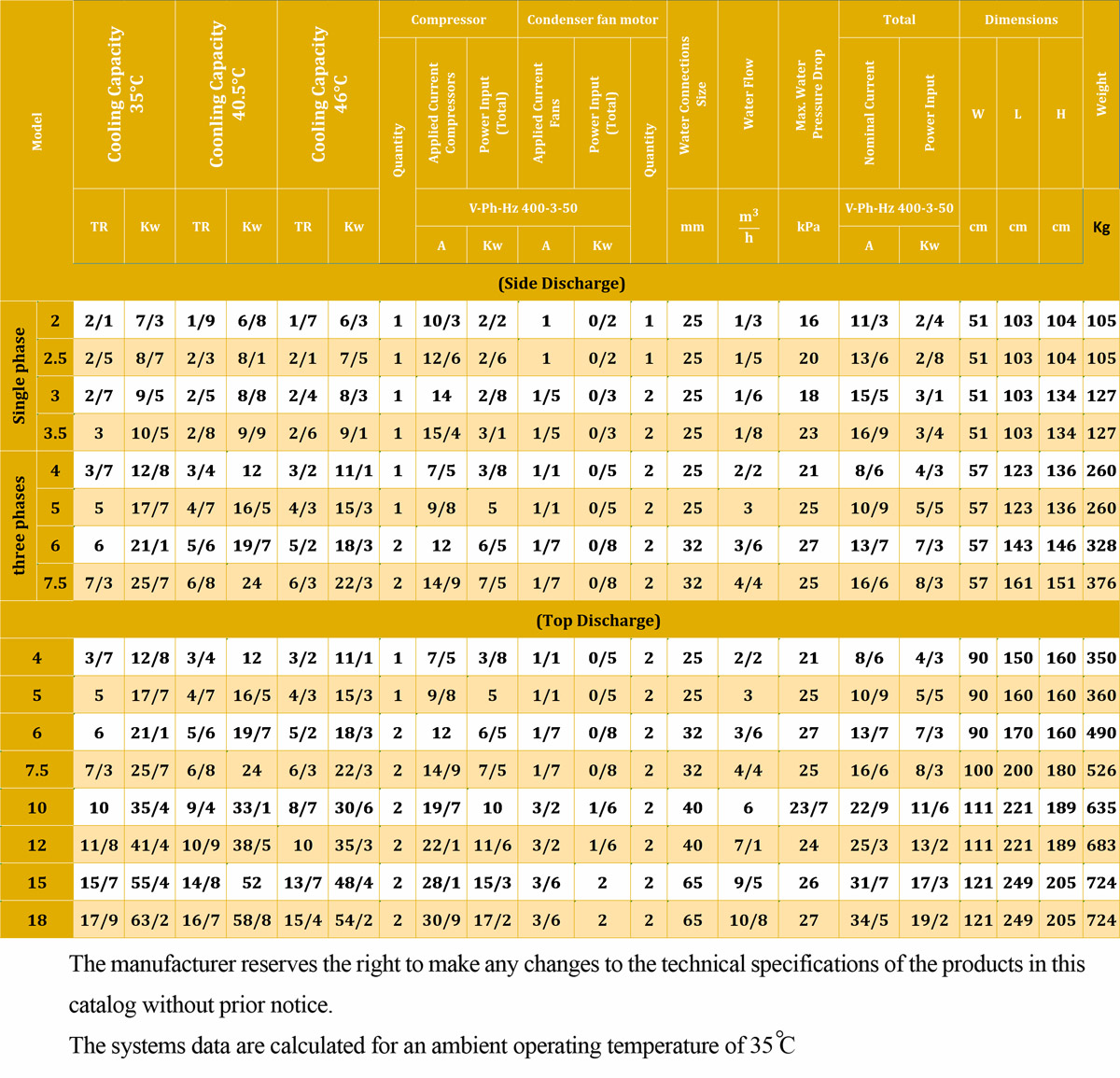 The Chillers (except single phase and 4 and 5 ton series) using two compressors causes optimal energy consumption in different modes.